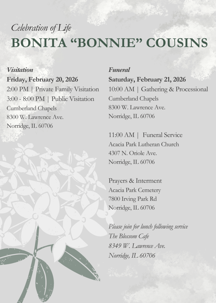 With heavy hearts, we share that our sister in Christ, Bonita “Bonnie” Cousins, passed through death into the eternal care of our Lord. Please hold Bonnie’s family and friends in prayer in this time of sorrow and grief.